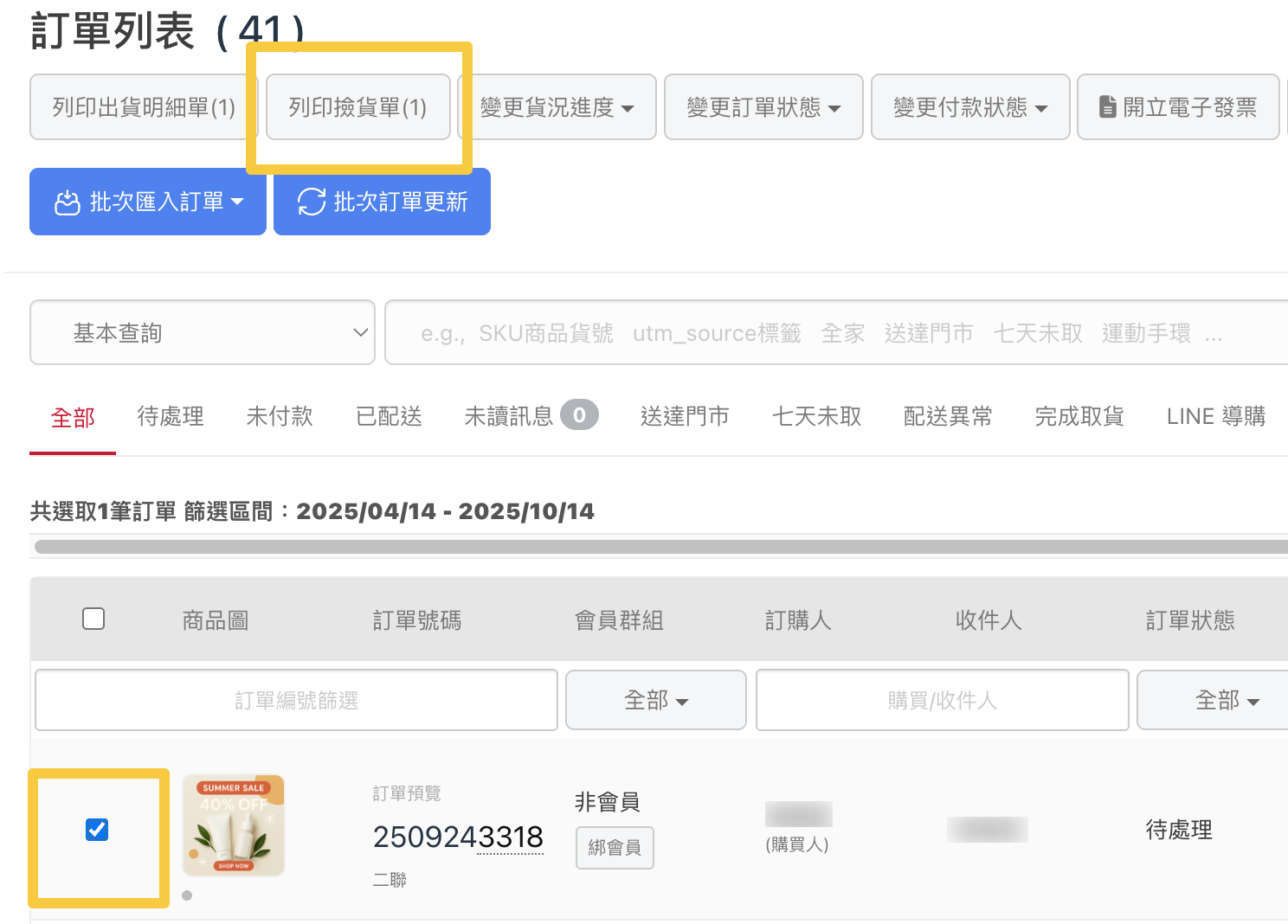 訂單管理 > 勾選要出貨的訂單 > 點擊上方「列印撿貨單」