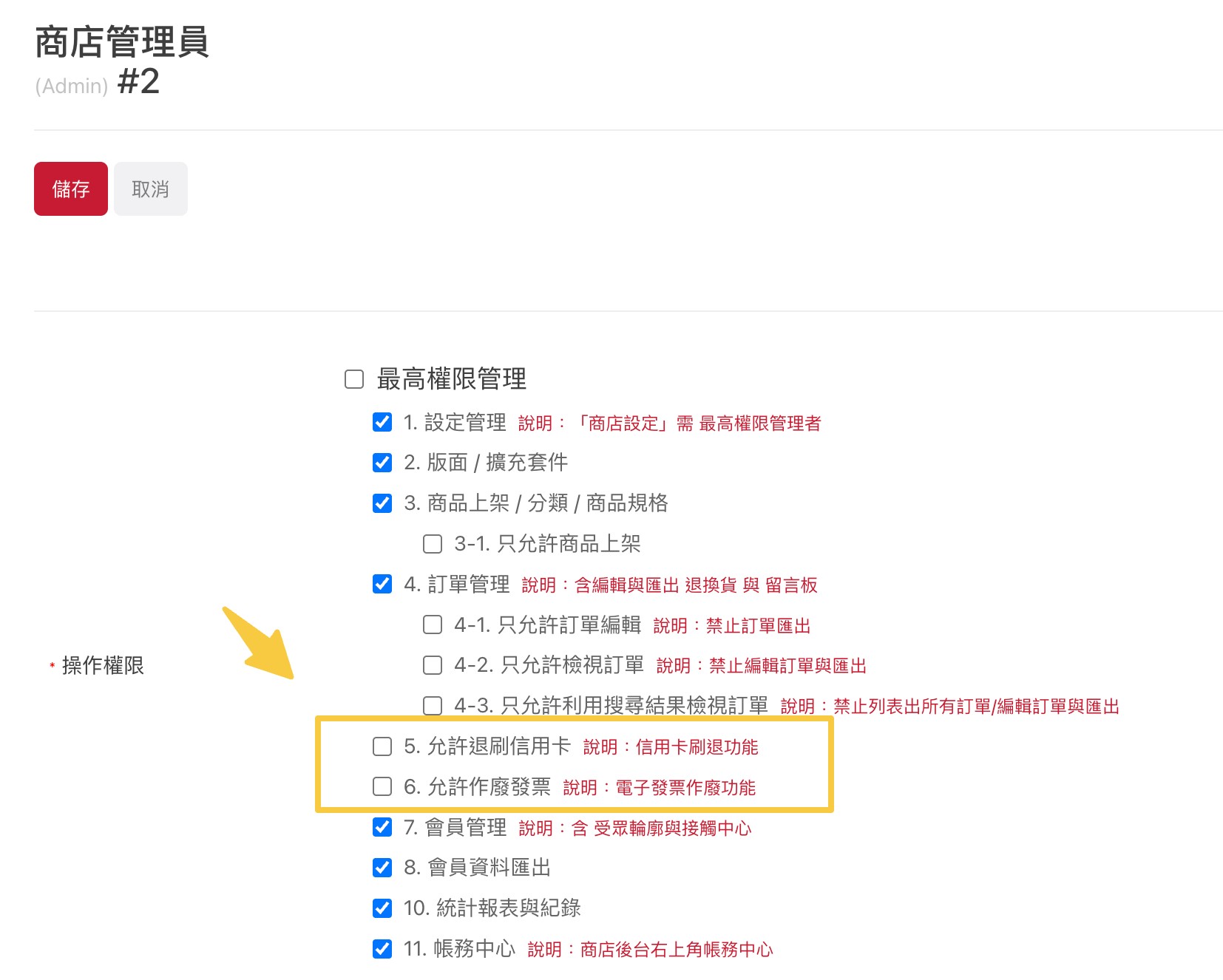 因應可以在訂單直接刷退信用卡及作廢電子發票,管理員也跟著增加權限控管。