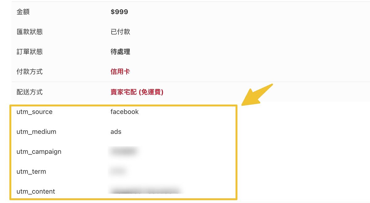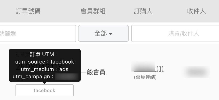 若該筆訂單未帶入 UTM 參數,則對應欄位會顯示為空白。