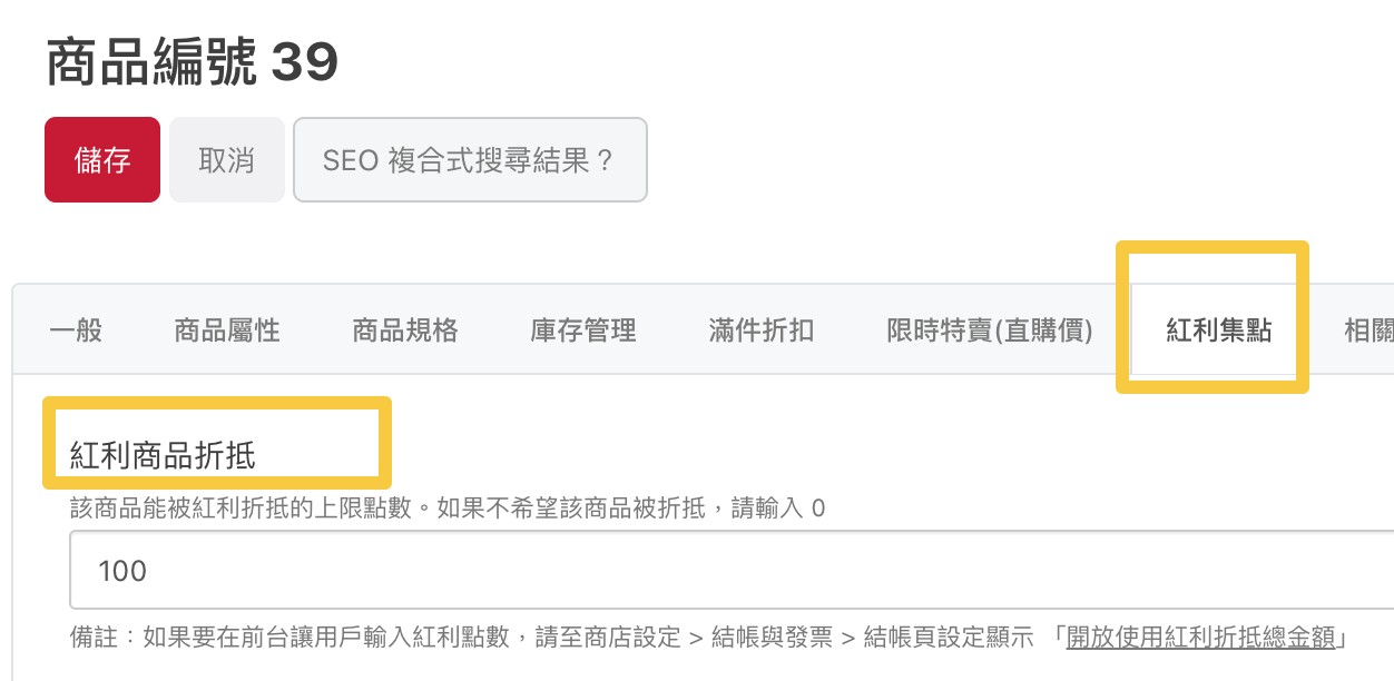 「商品編輯 > 紅利集點」找到「紅利商品折抵」區塊
