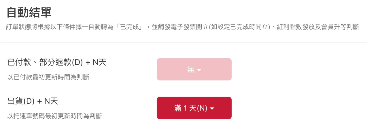 為了讓訂單流程更符合實際作業需求,自動結單功能新增 「已出貨 D+N 天」自動結單 判斷條件。