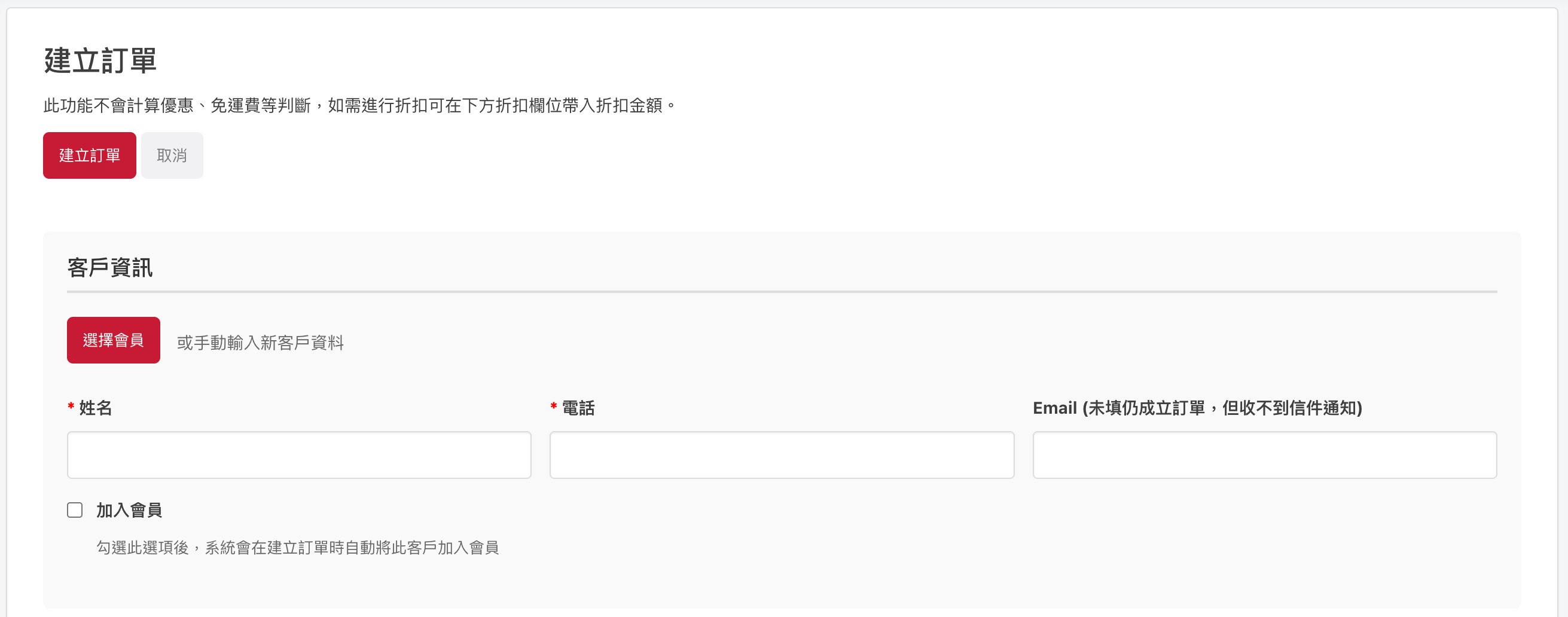 1. 「訂單管理 > 訂單列表 > 建立訂單」