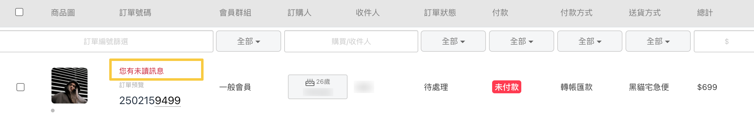 當該筆訂單有顧客留下訊息,該筆訂單編號上方將出現「您有未讀訊息」提醒商家;已讀過後該文字將會消失。