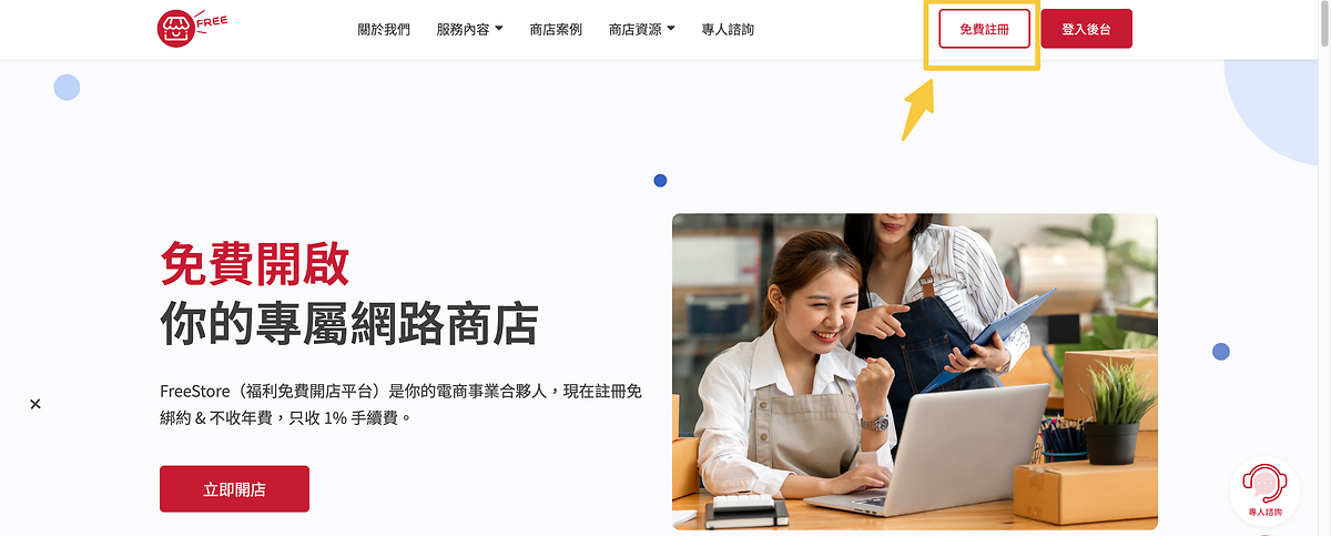 步驟一、至 FreeStore 官網,點擊右上角「免費註冊」