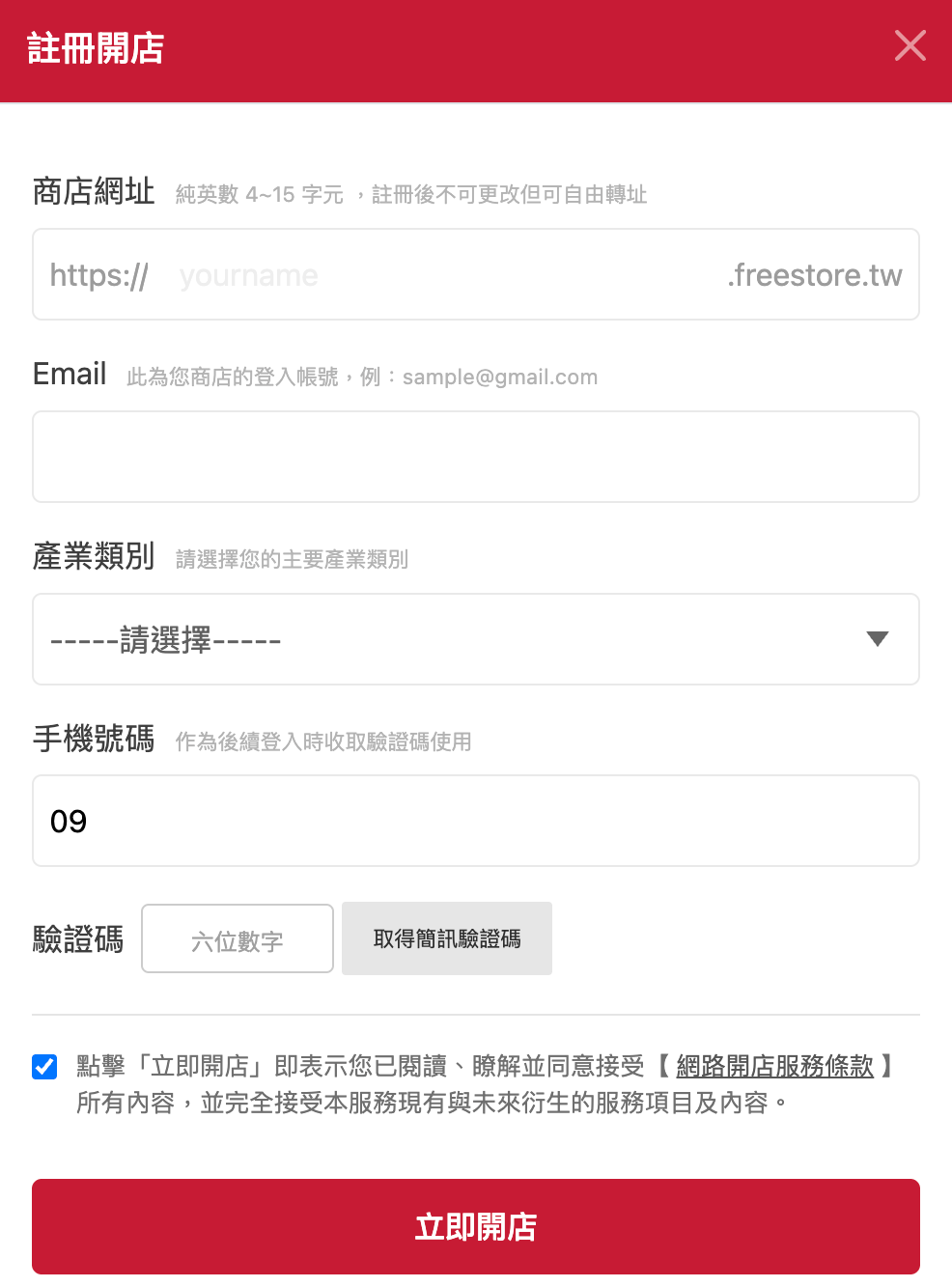 填寫資料 > 輸入手機簡訊驗證碼 > 點選「立即開店」