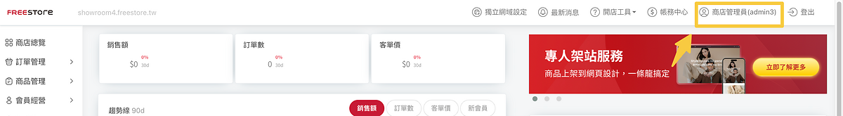 順利進入管理後台後,於右上方「商店管理員」進行首次帳號密碼更新