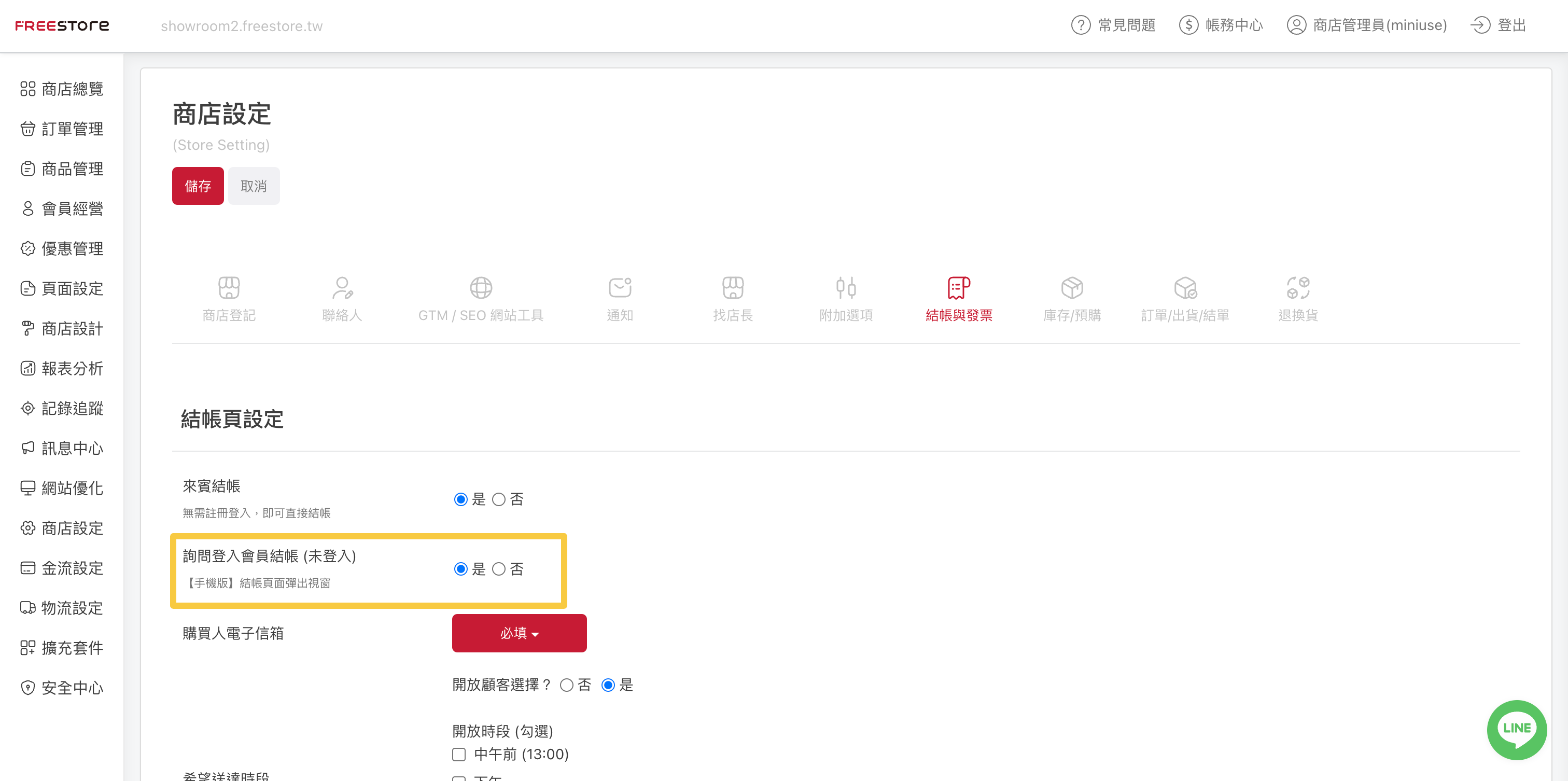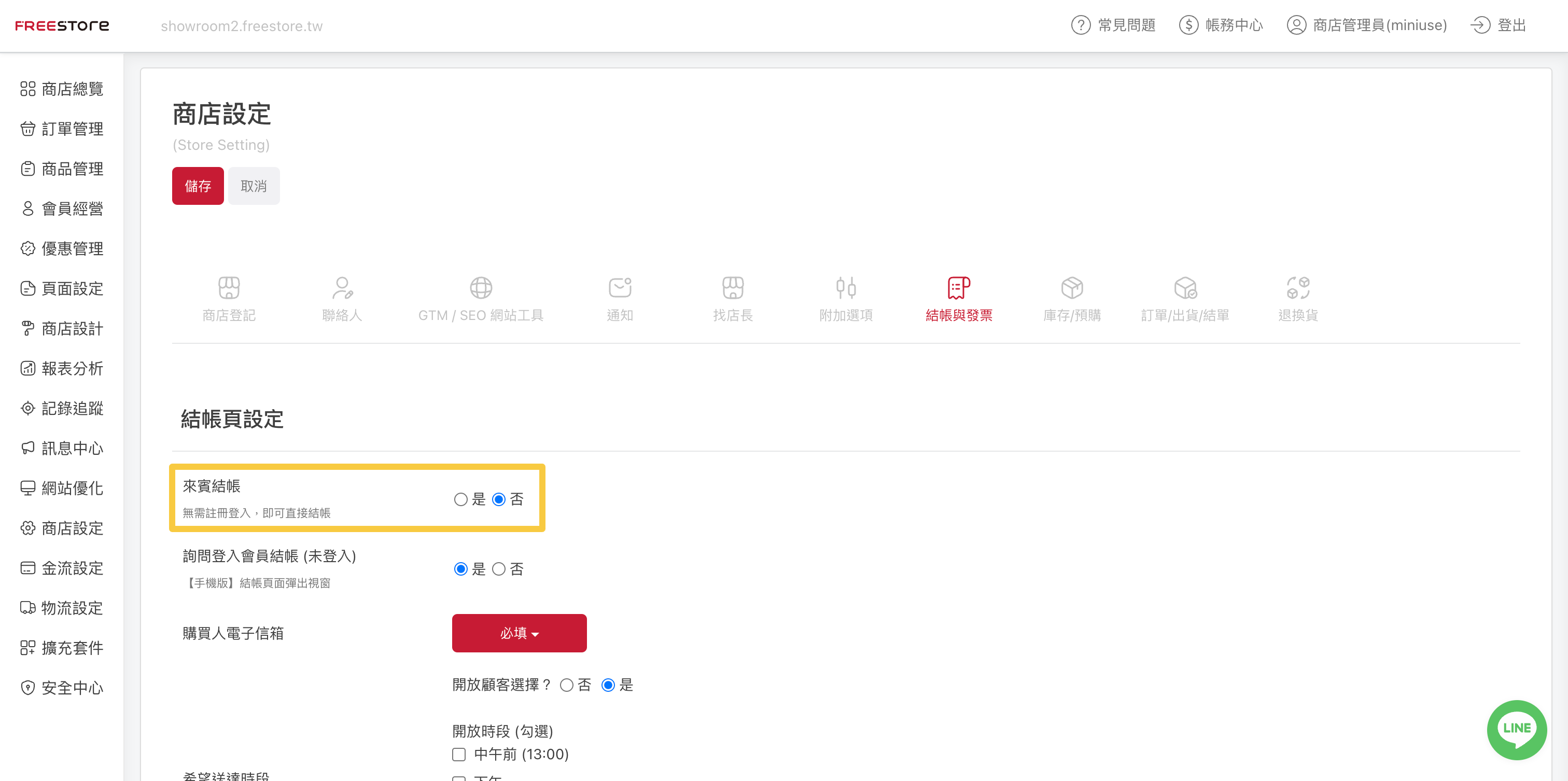 「商店設定 > 結帳與發票 > 來賓結帳 > 否」