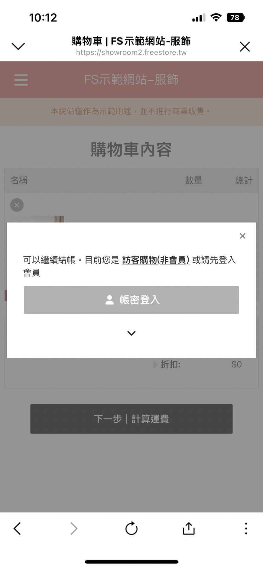 開啟強制登入結帳後,顧客在未登入狀態下進入到購物車前會自動跳轉會員登入畫面