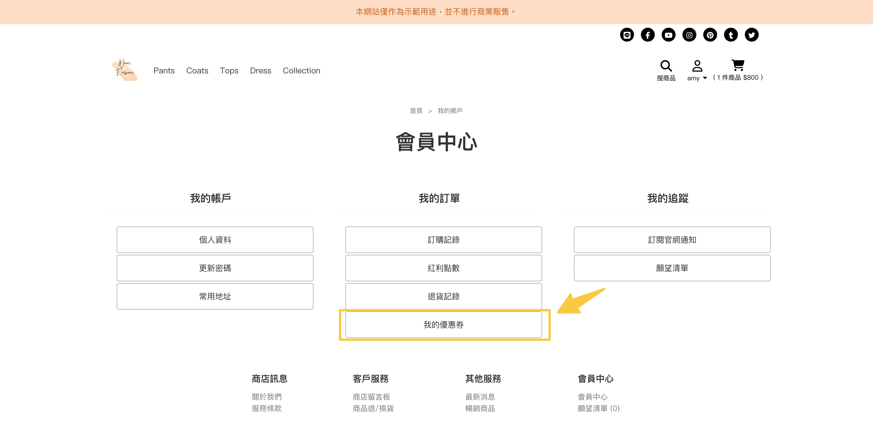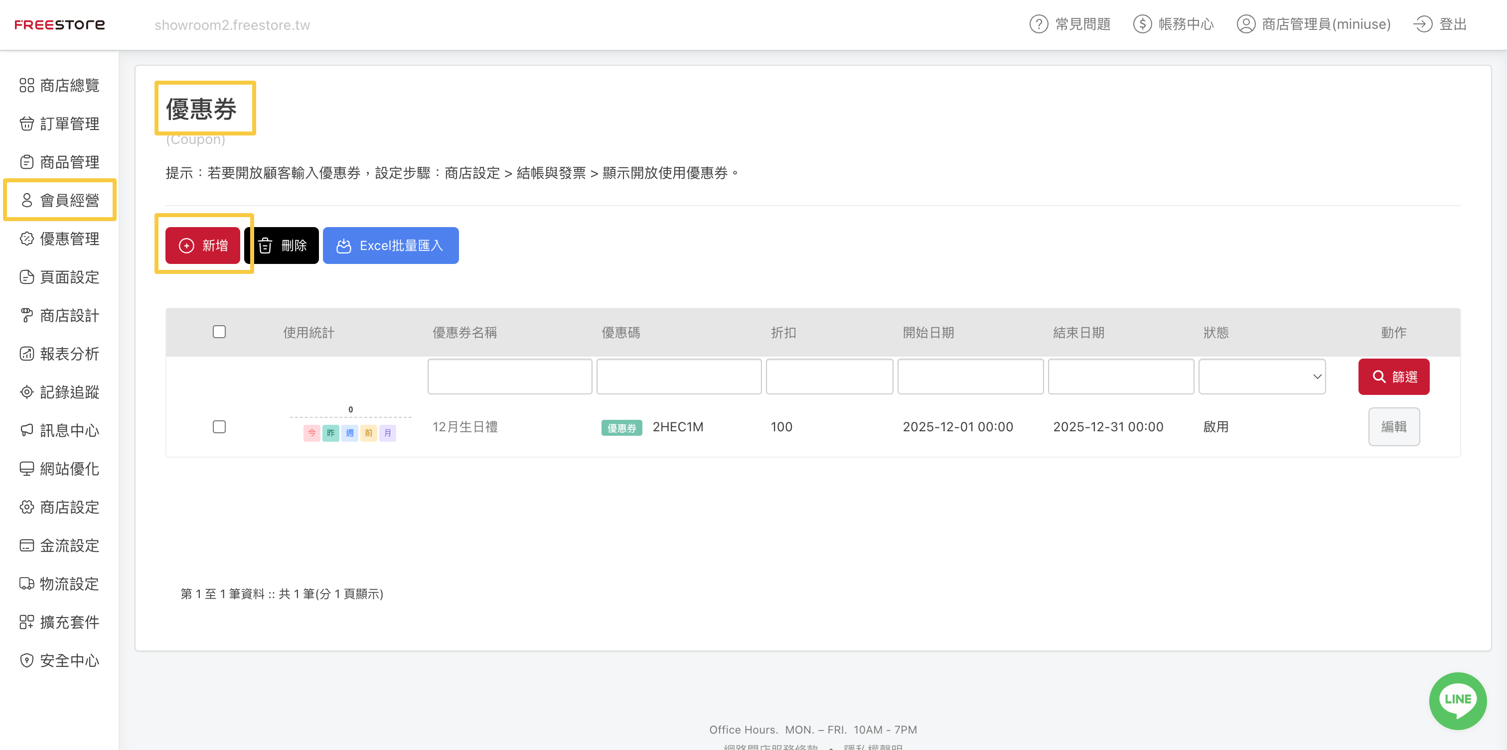 > 至「商店設定 > 結帳與發票」檢查「開放使用優惠券 (COUPON)」是否開啟。