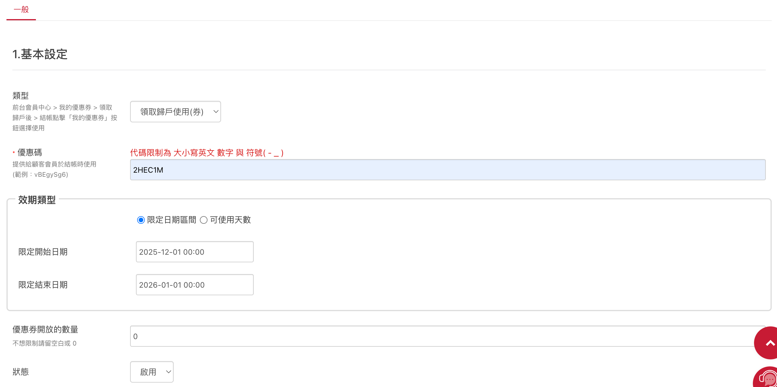・優惠券開放的數量:若欲寄發給所有當月生日的會員,可直接設定 0(無限)