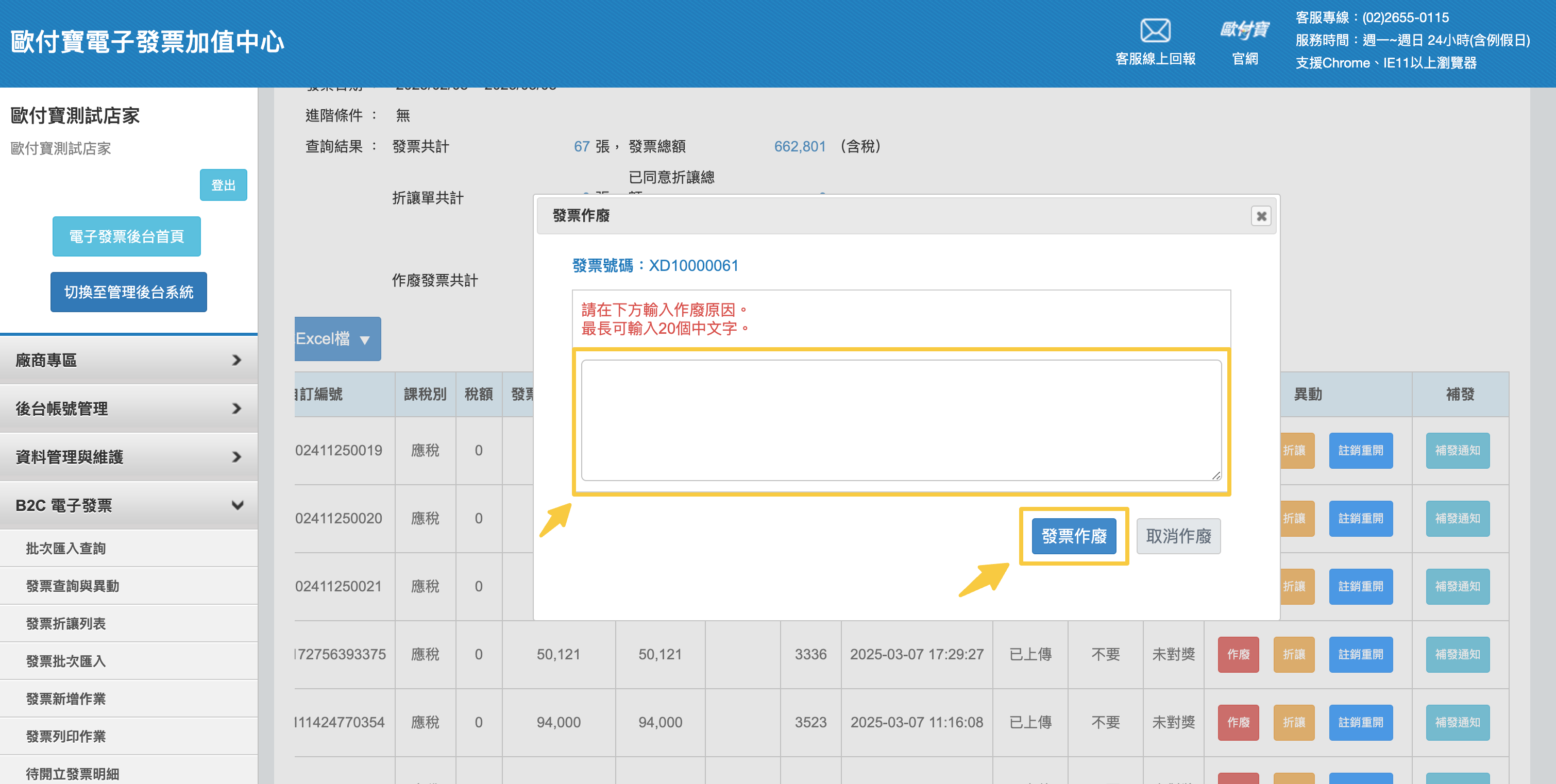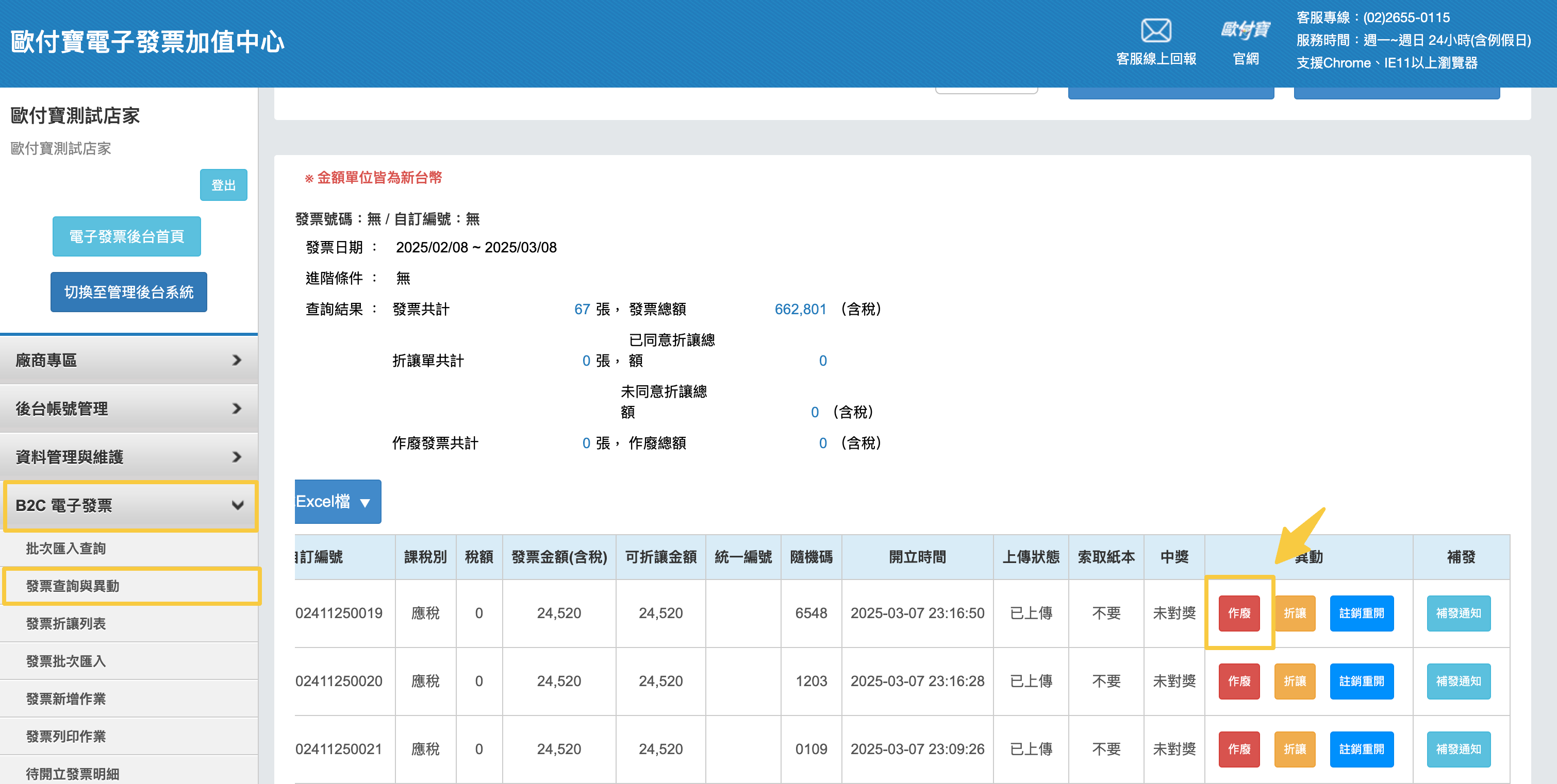 步驟一、「歐付寶廠商管理後台 > 切換至電子發票系統 > B2C電子發票 > 發票查詢與異動 > 查詢想要作廢的發票 > 作廢」