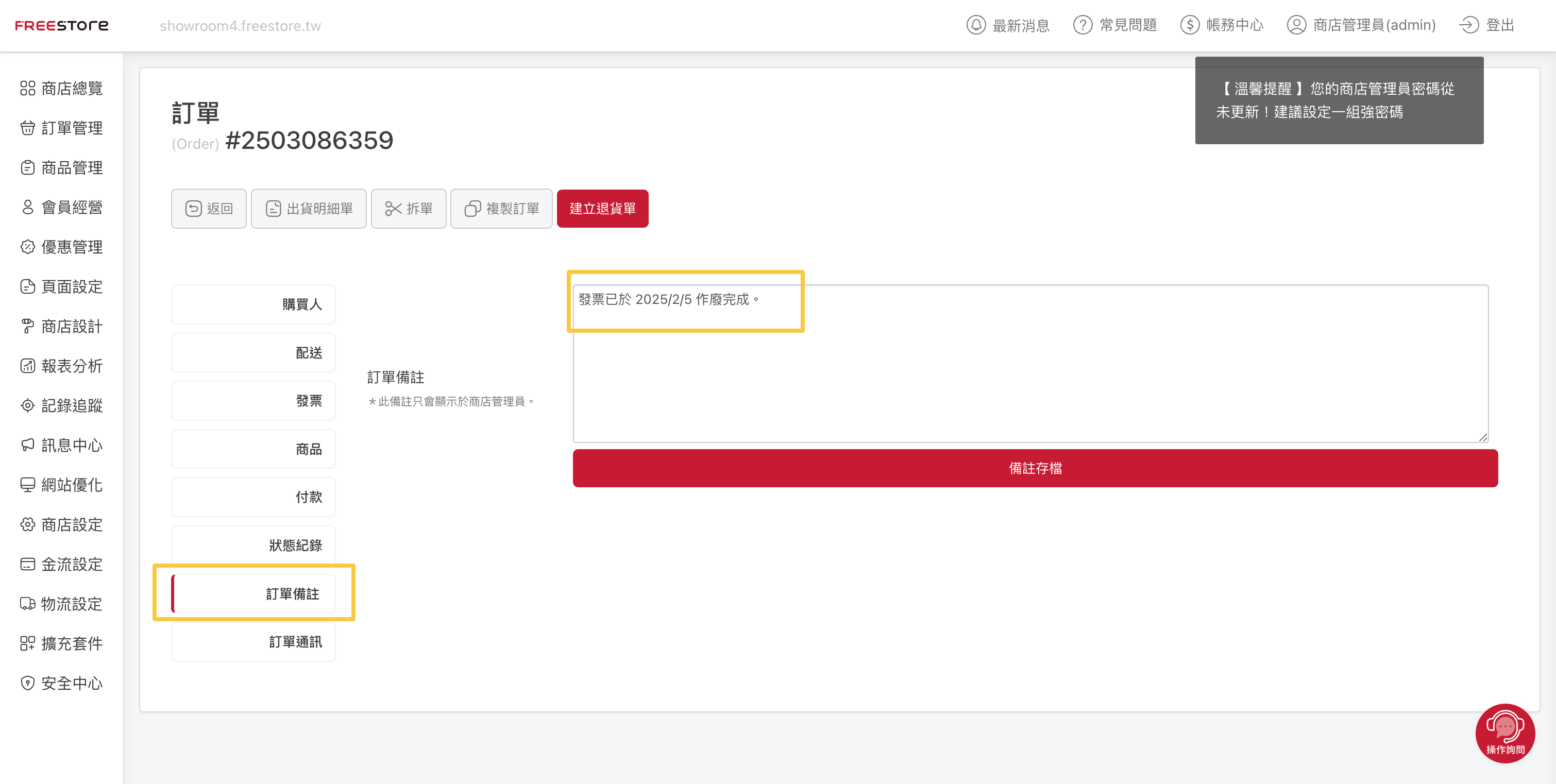 步驟三、於 FreeStore 訂單細節 > 訂單備註註記發票相關事宜