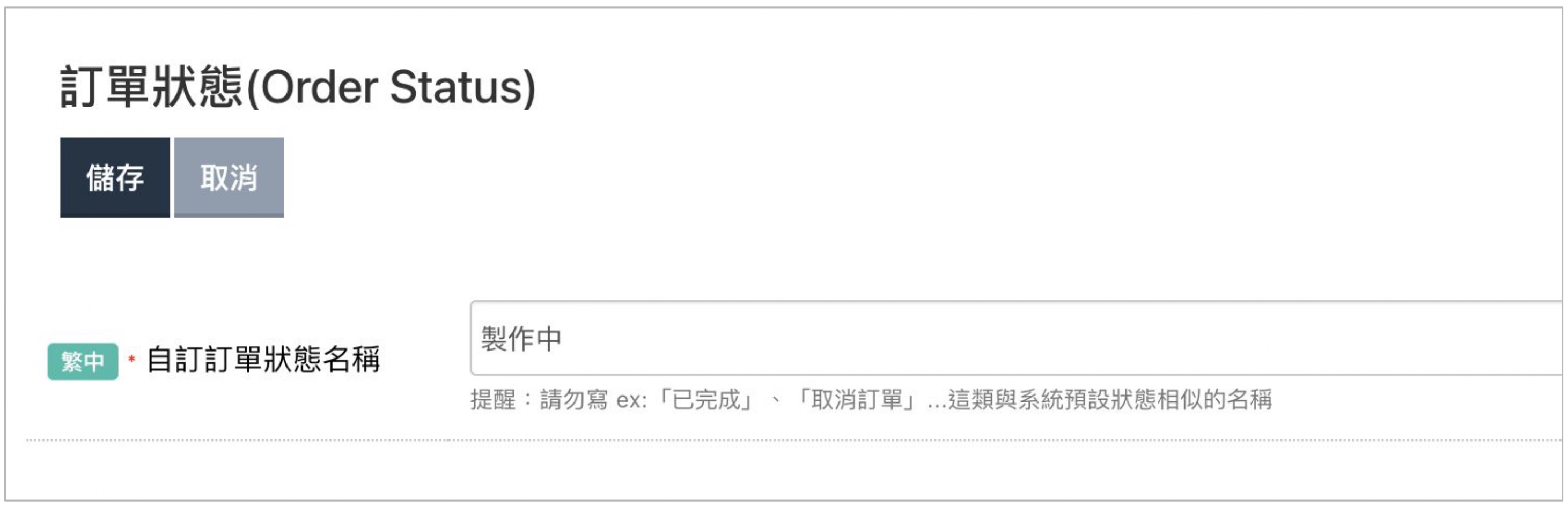步驟二、新增狀態 > 自訂訂單狀態名稱 > 儲存