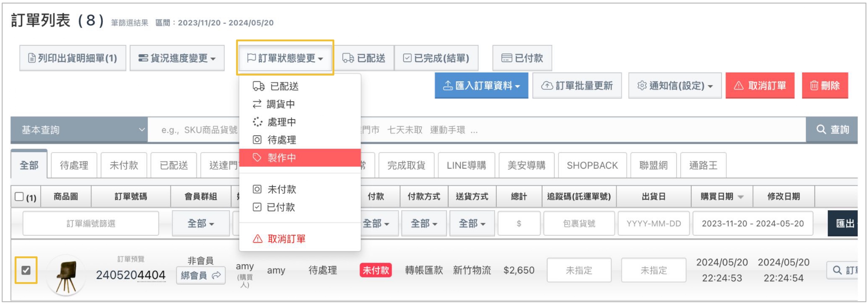 步驟三、「訂單管理 > 訂單瀏覽 > 勾選訂單 > 訂單狀態變更」,檢查是否可將訂單轉到自訂狀態
