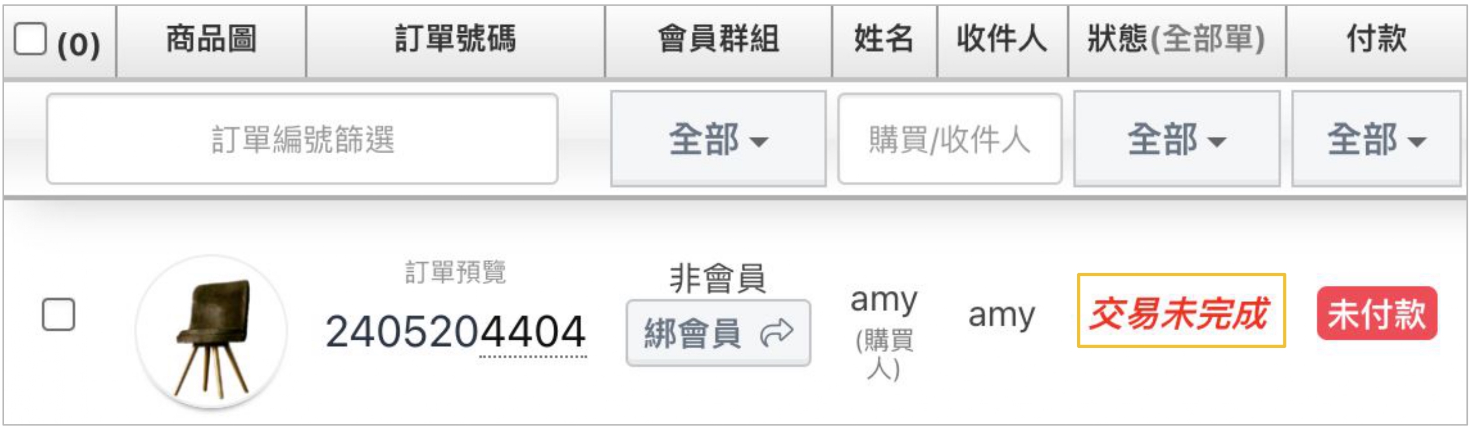 2. 該狀態下的訂單將轉換成「交易未完成」狀態
