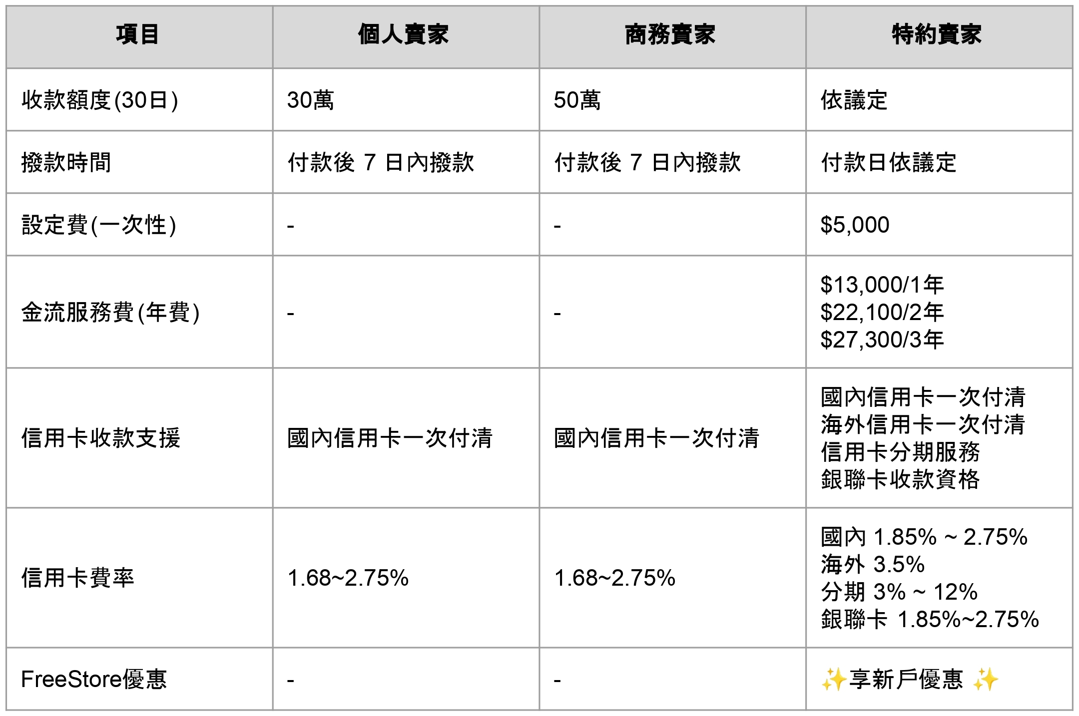 需要享有特約賣家的收款服務,但有初始設定費、年費,別擔心!FreeStore 幫你省下這筆錢!