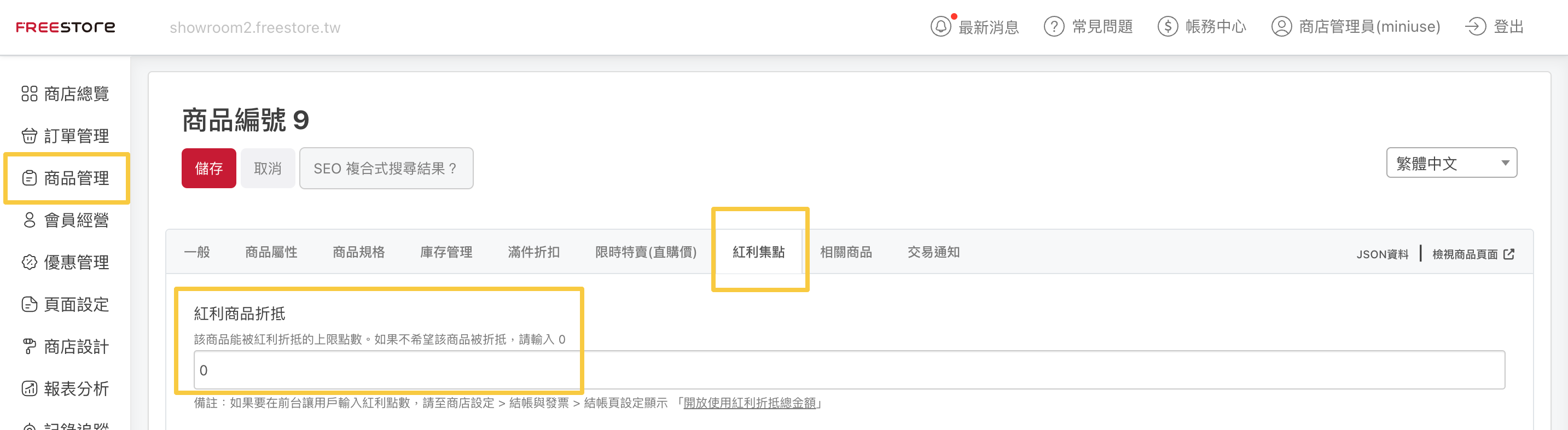 「商品編輯 > 紅利集點 > 紅利商品折抵」,輸入該商品最高可折抵點數