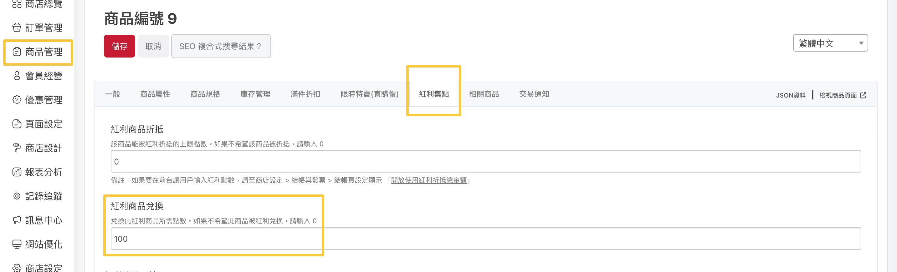 「商品編輯 > 紅利集點 > 紅利商品兌換」,輸入可兌換此商品的紅利總額