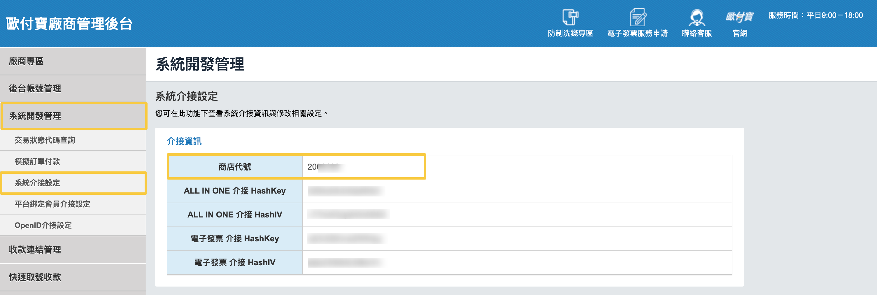 步驟一、登入歐付寶廠商後台 > 系統開發管理 > 系統介接設定 > 複製「商店代號」
