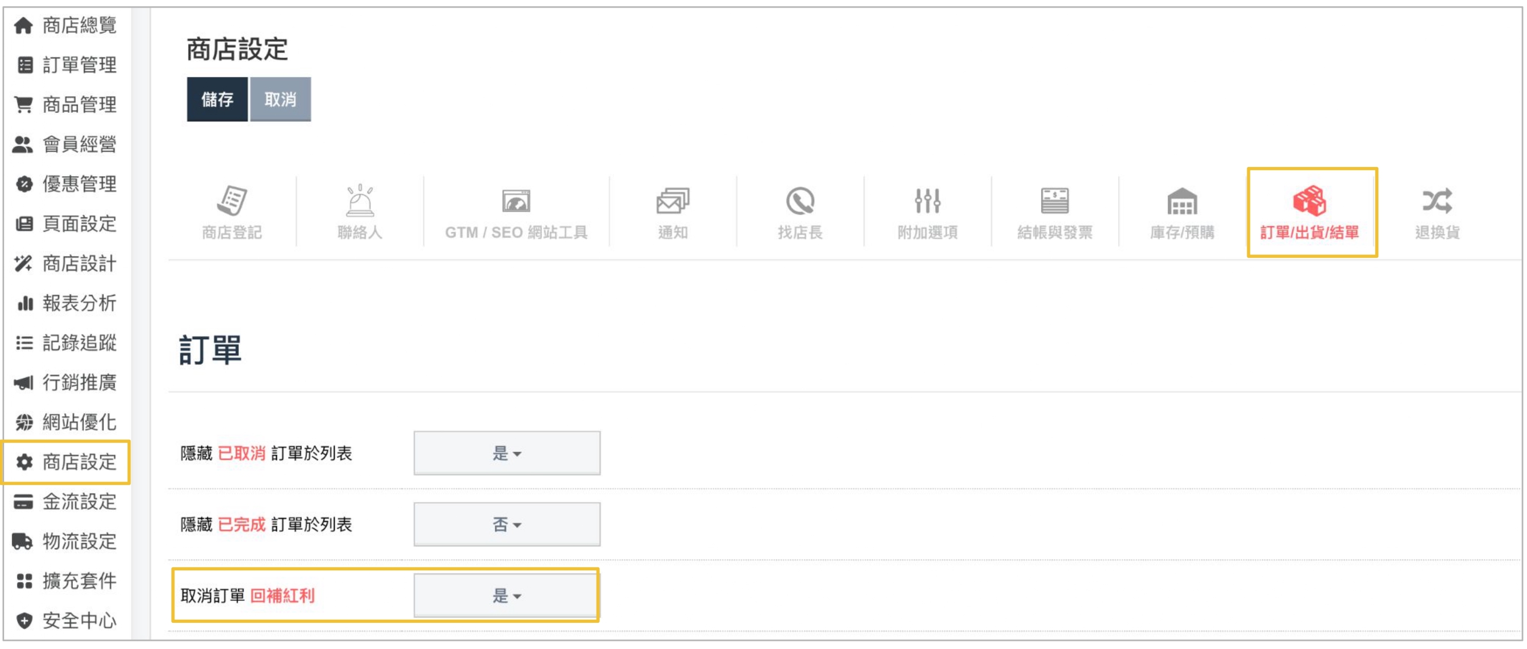 步驟一、管理後台「商店設定 > 訂單/出貨/結單 > 取消訂單回補紅利」
