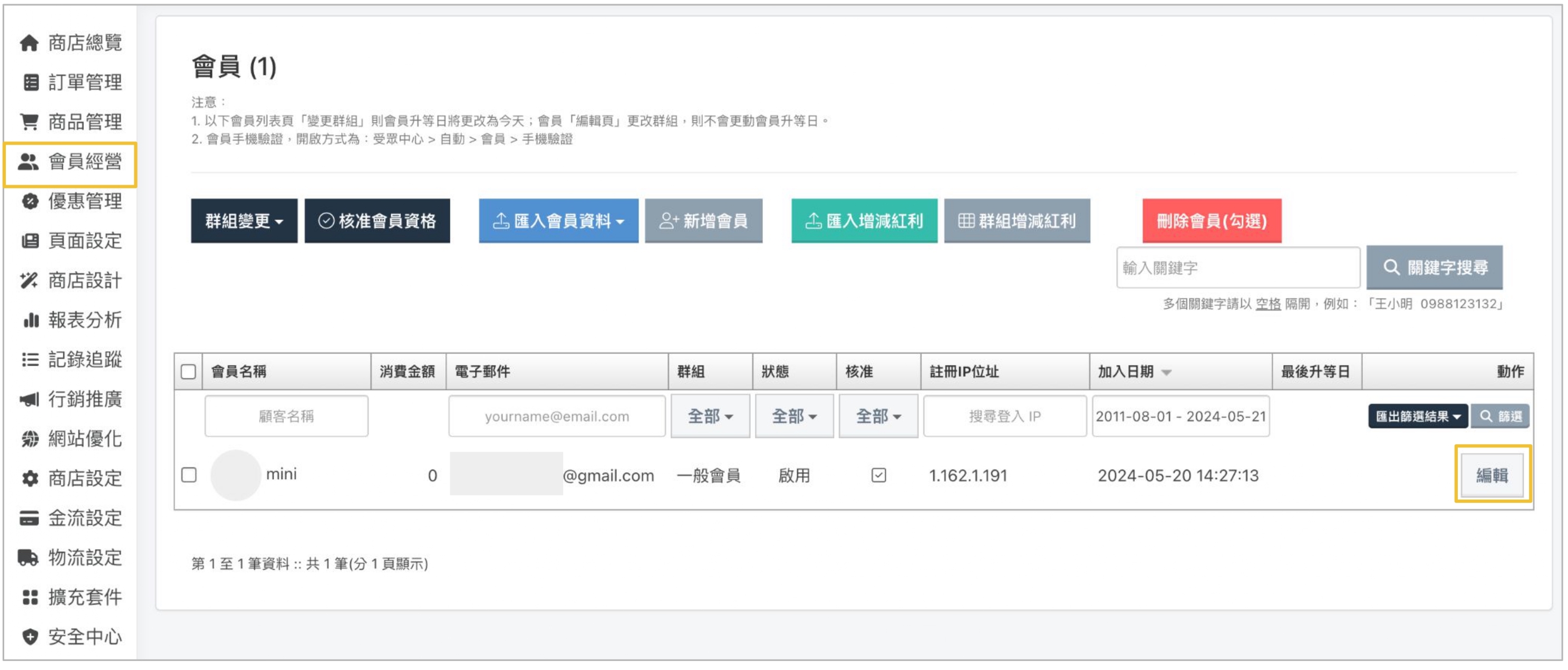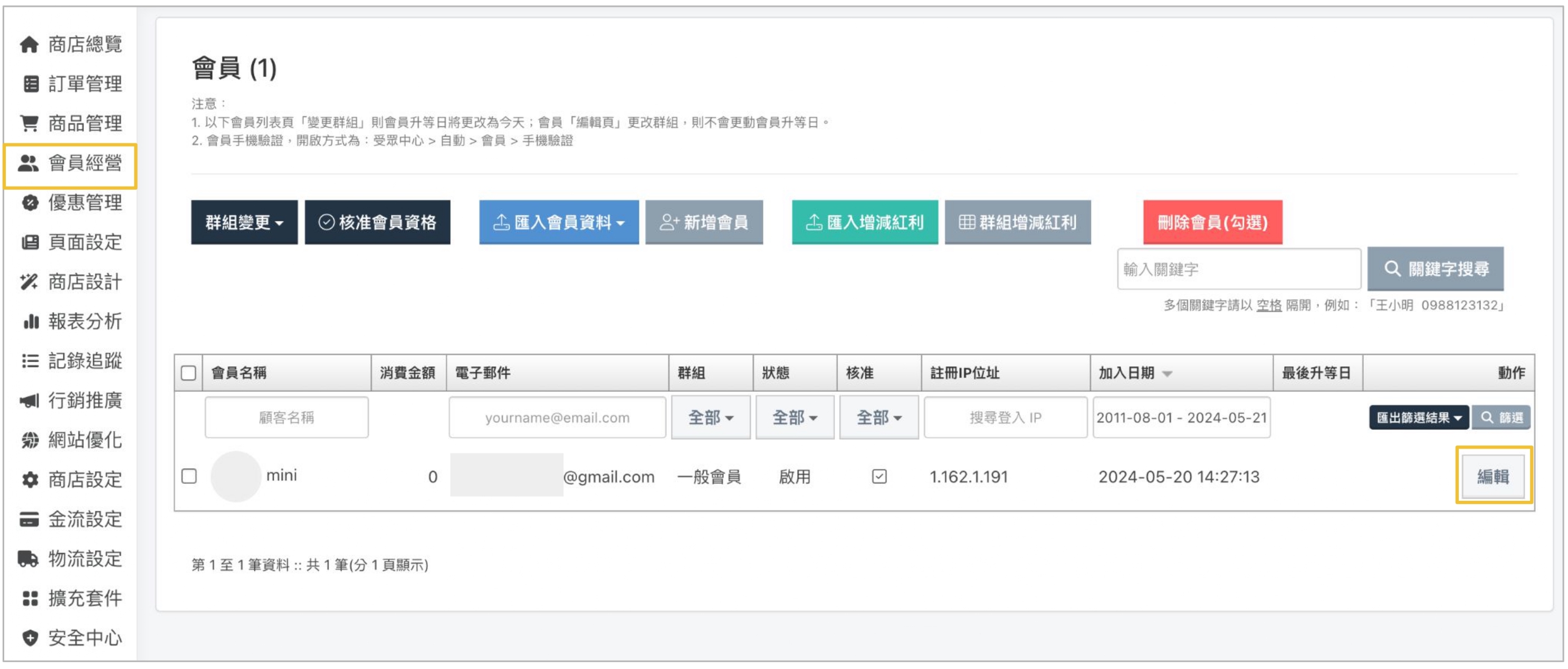 步驟一、管理後台「會員經營 > 會員 > 編輯」