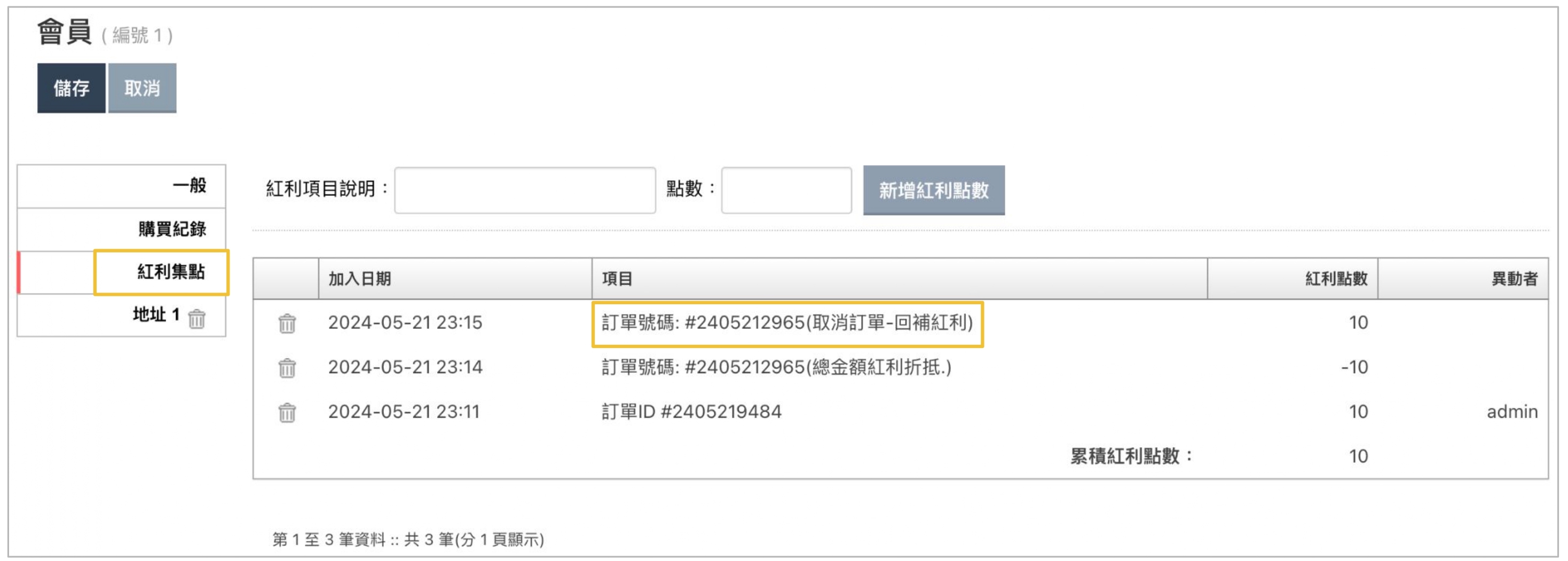 若商店有開啟訂單紅利折抵,可以設定在取消訂單後要不要退還紅利給會員。
