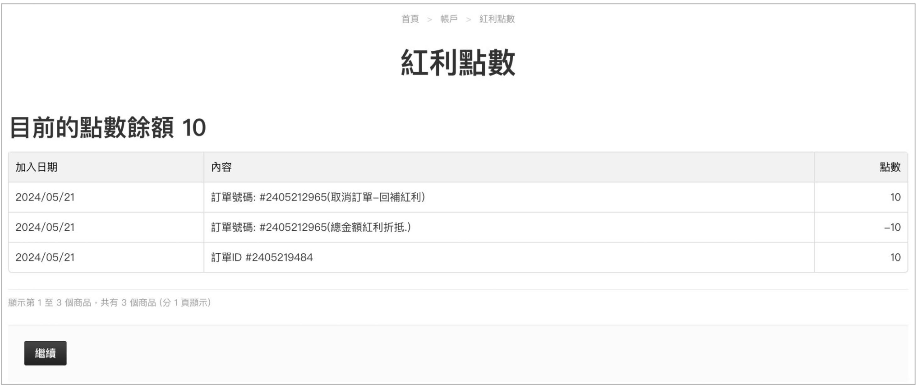 顧客登入會員帳戶 > 紅利點數所看到的紀錄