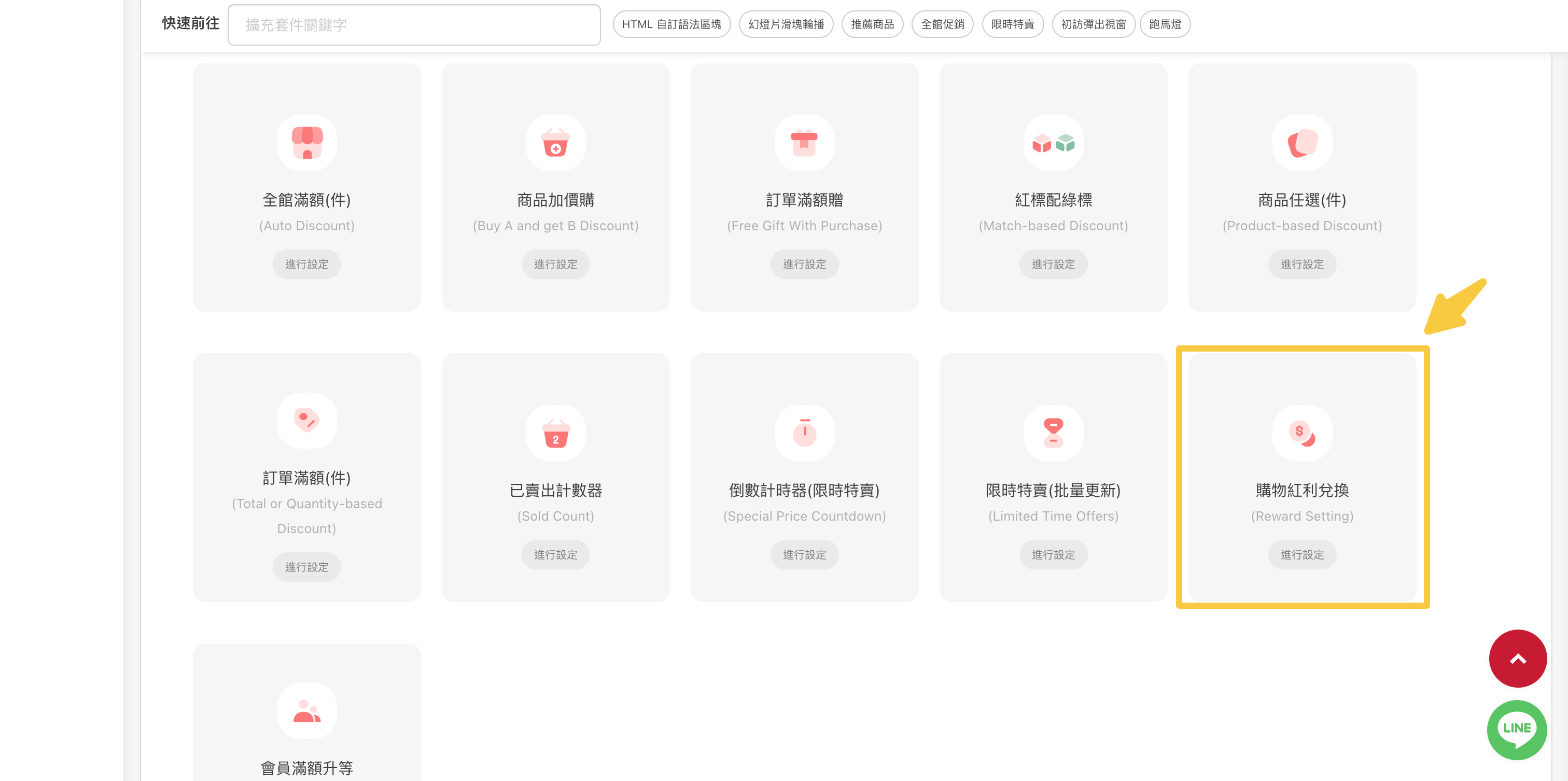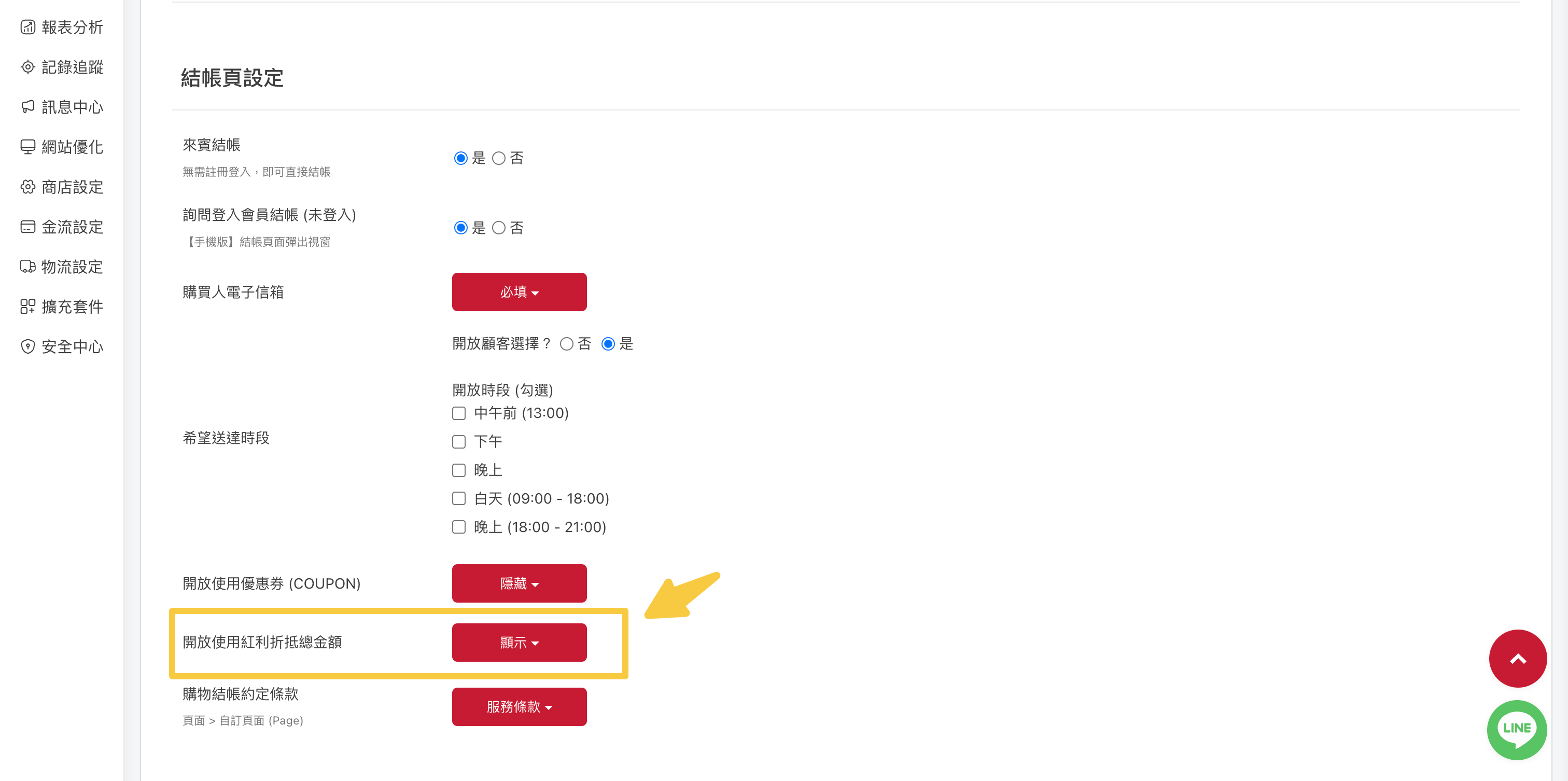 步驟三、「商店設定 > 結帳與發票 > 開放使用紅利折抵總金額 > 顯示」