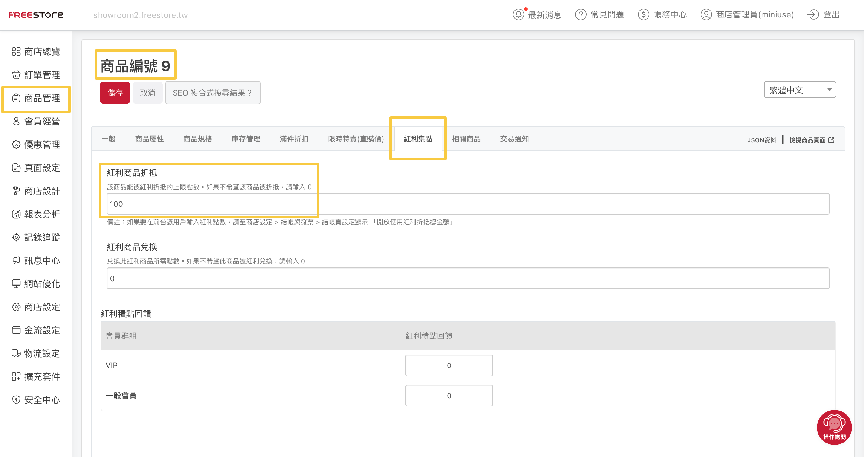 步驟四、「商品管理 > 商品編輯 > 紅利積點」,設定商品紅利折抵上限