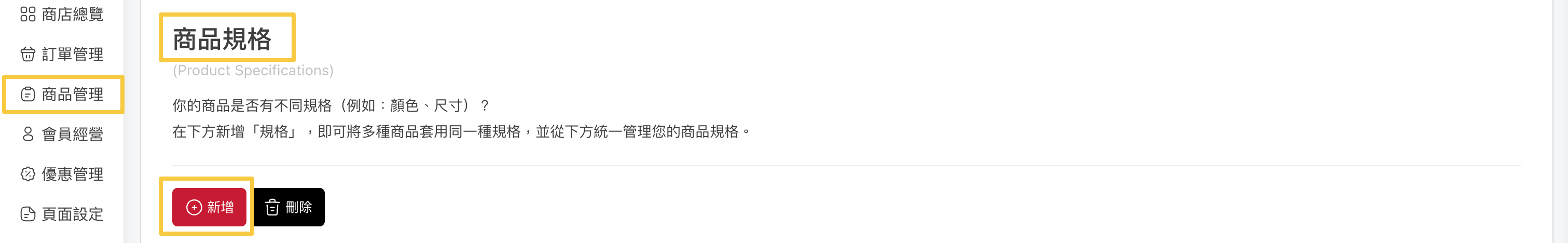「商品管理 > 商品規格 > 新增」