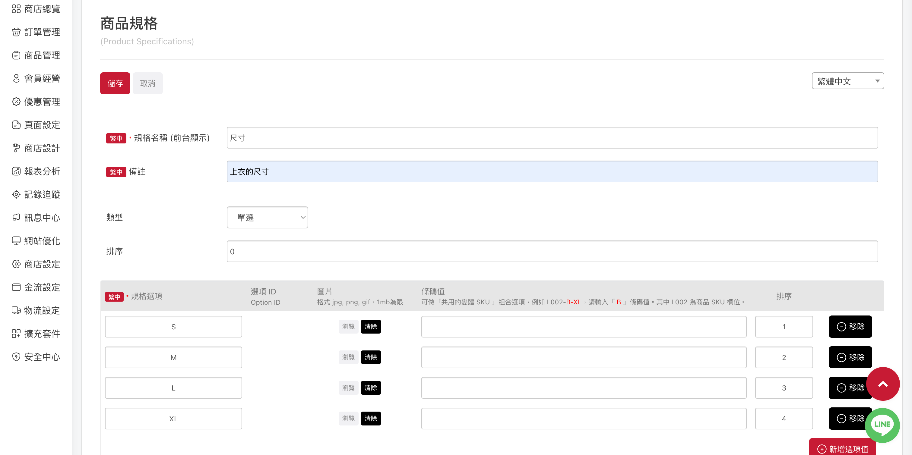 ・備註:若多個規格名稱相同,備註可新增註記,以方便後續在商品中抓取規格時辨識