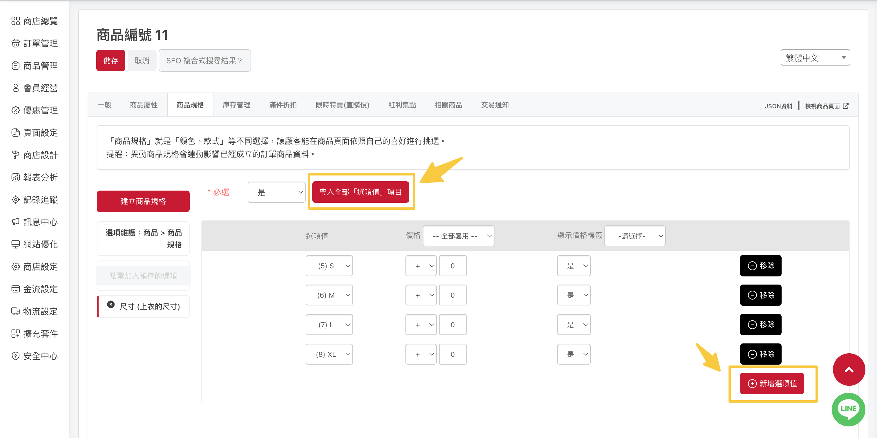 。規格選項:規格底下的選項,需逐一新增