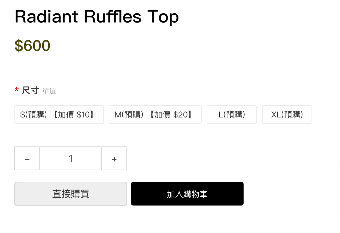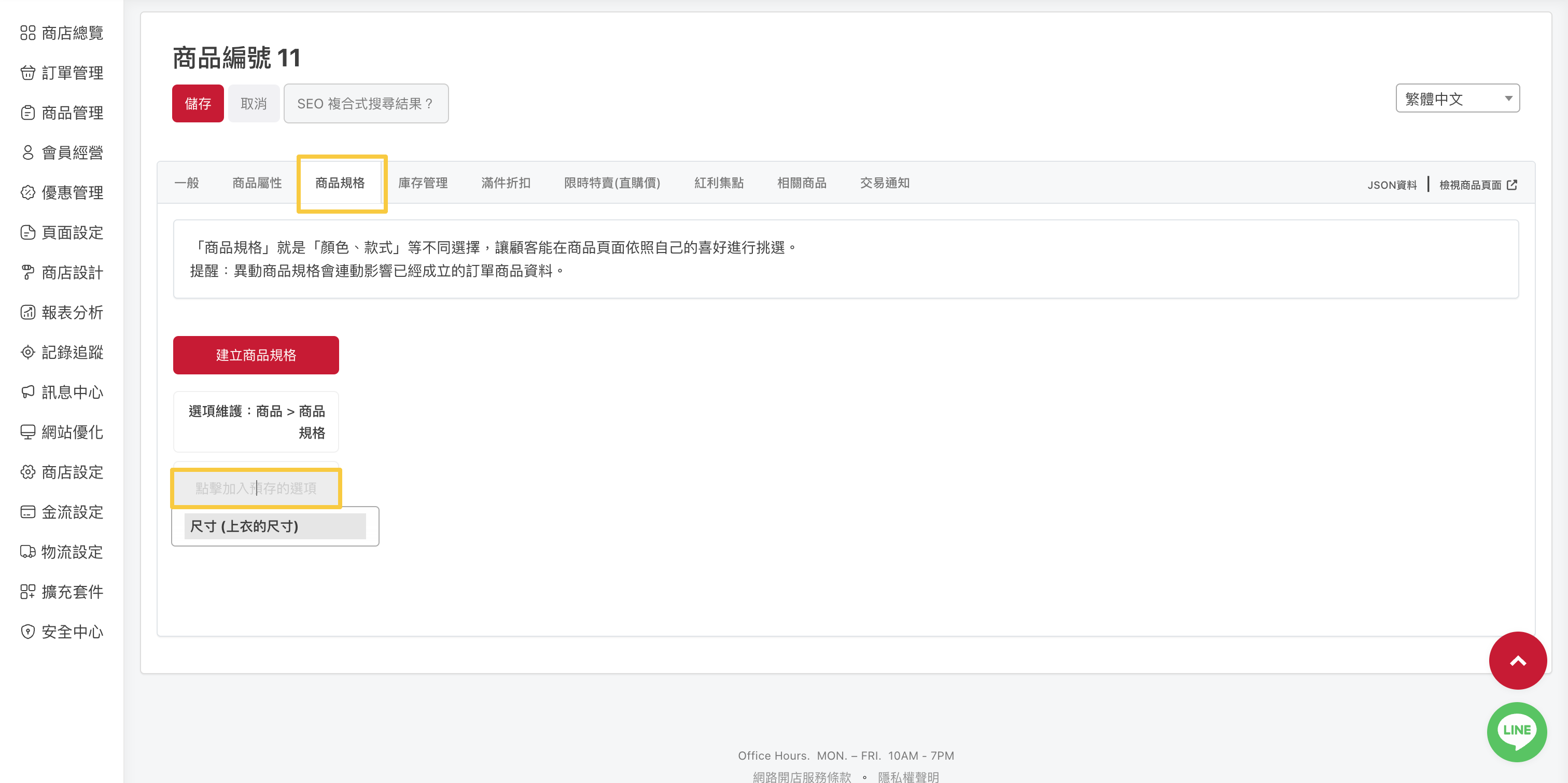 當商品有不同款式時,可以使用商品規格的功能來新增規格與其選項,讓顧客在加入購物車前進行選擇