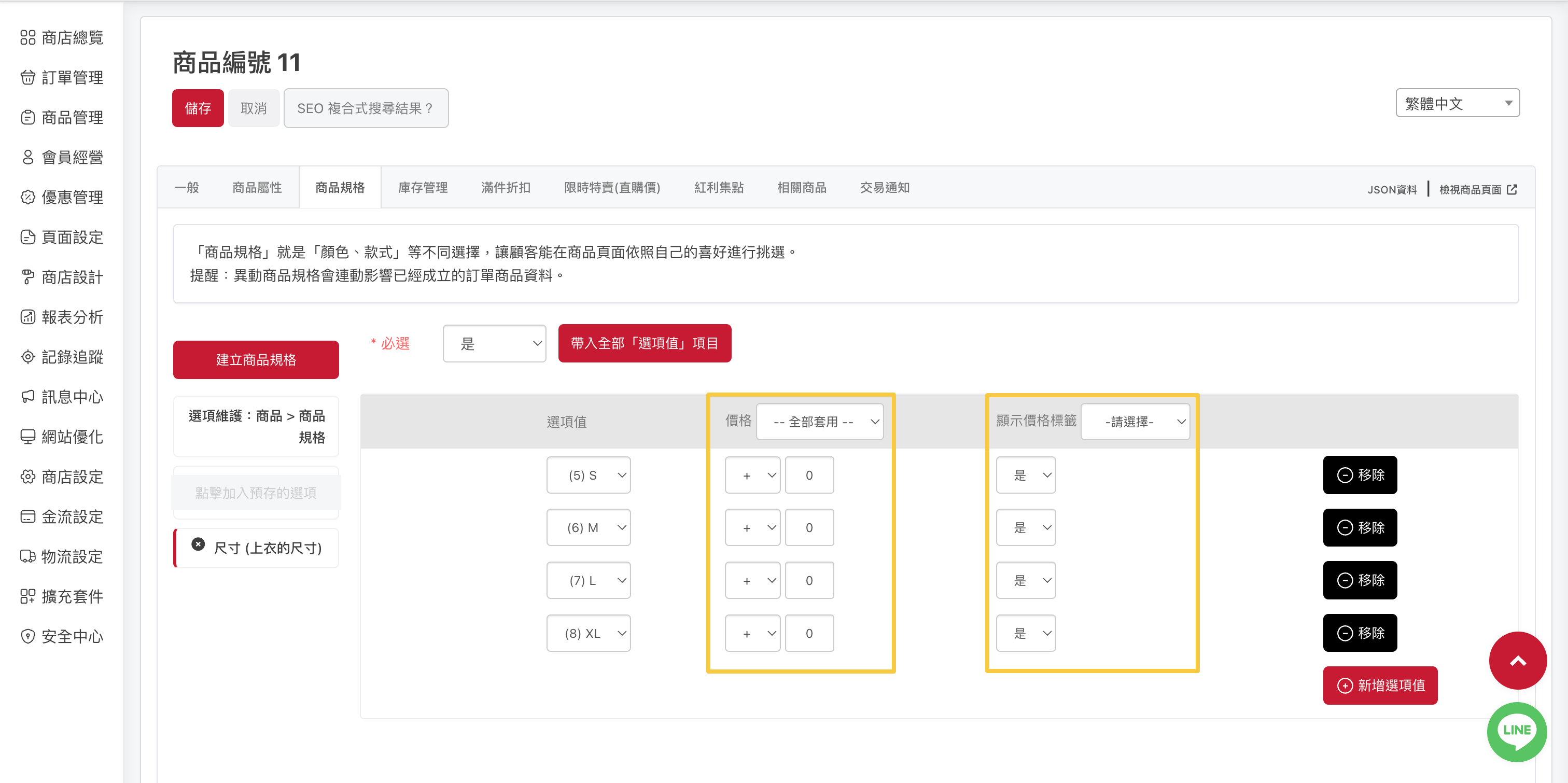 ・價格:以商品售價為基準,可調整不同選項的價格