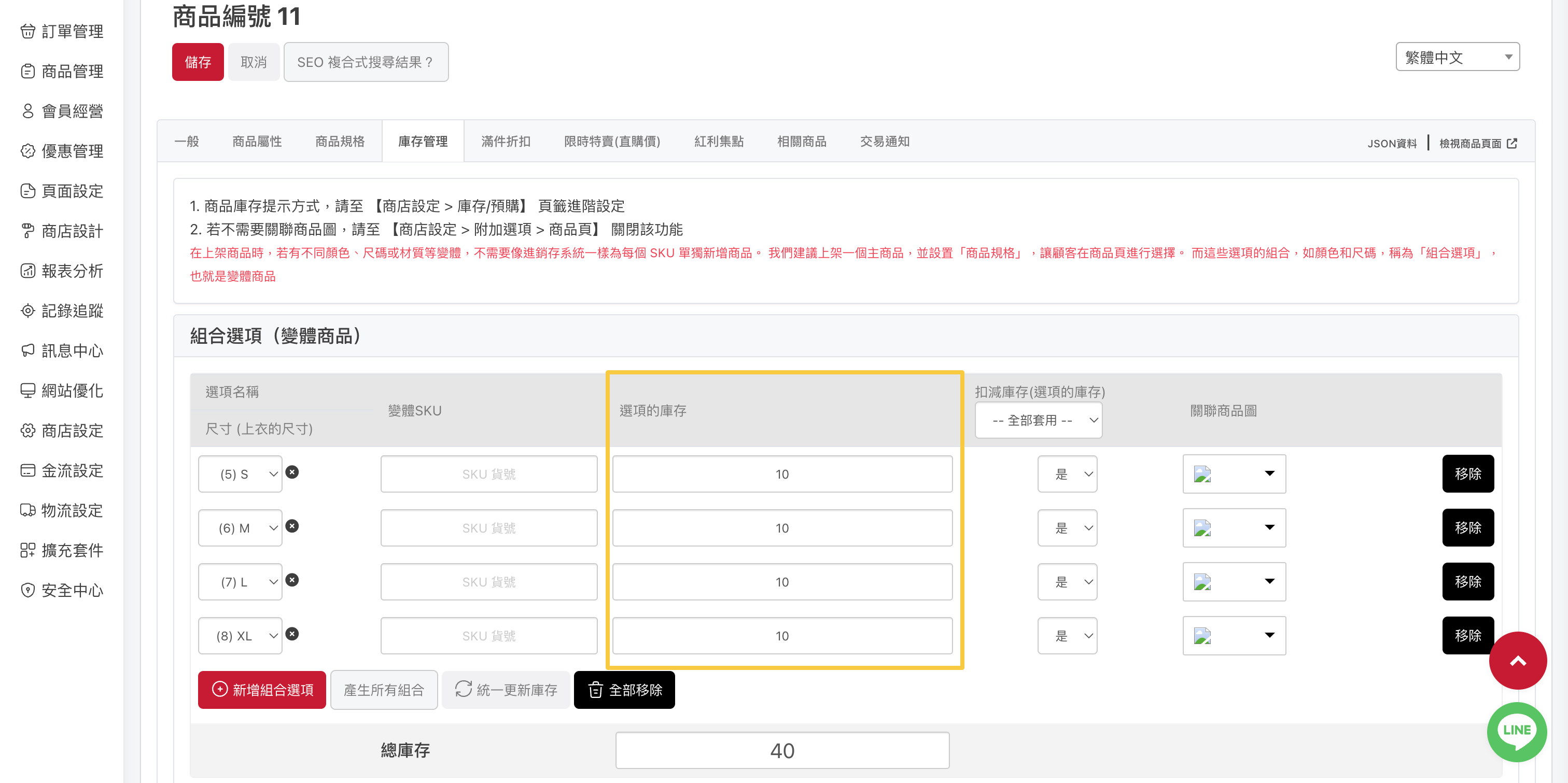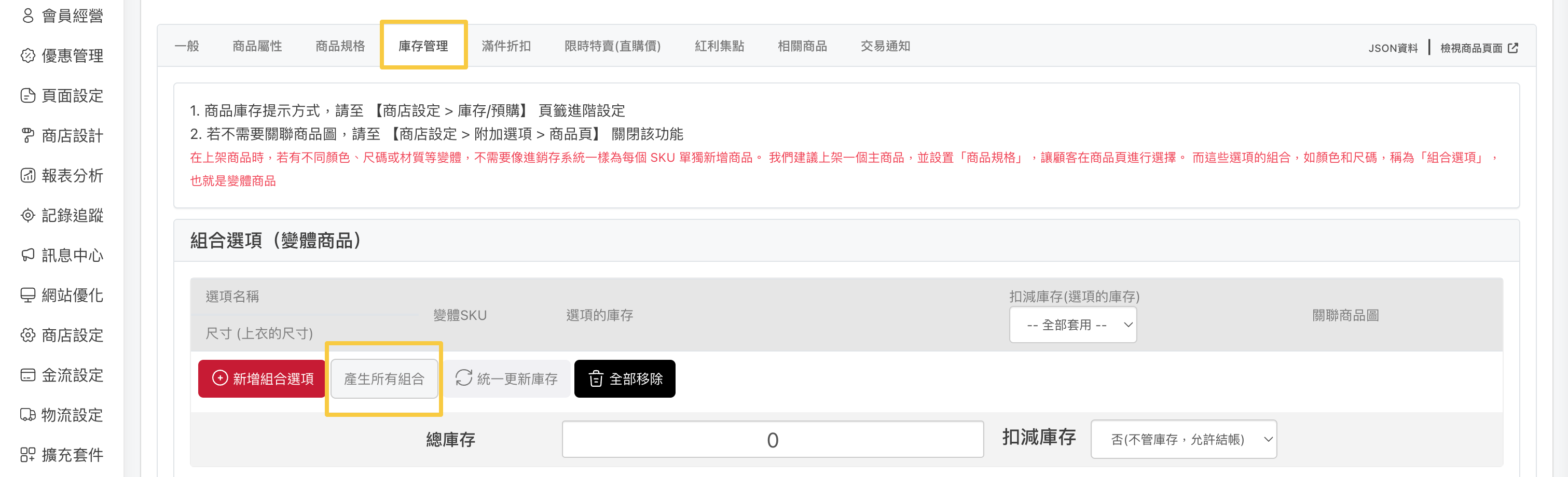 「商品管理 > 上架商品 > 商品編輯 > 庫存管理 > 產生所有組合」,可自動帶入前一步驟帶入的商品規格