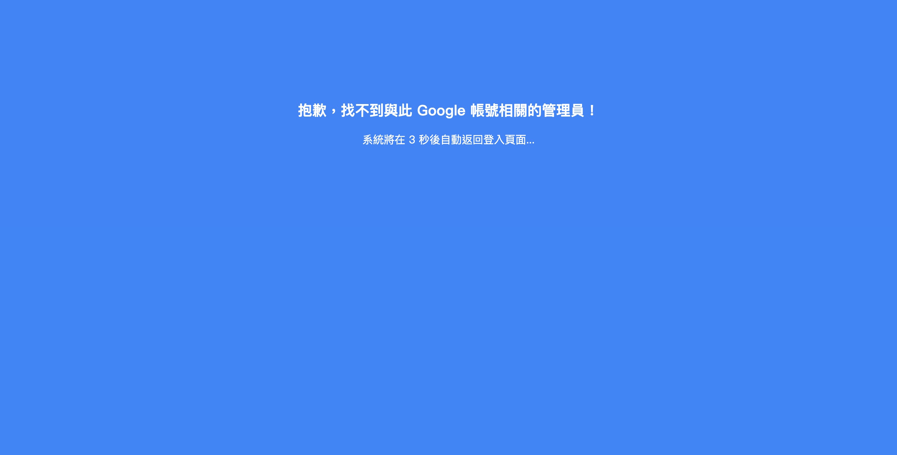 當 Google登入帳號不符合管理員聯絡人電子信箱,五秒後將自動跳轉回後台登入畫面,請重新選擇 Google帳號或是以原先後台帳號密碼登入。