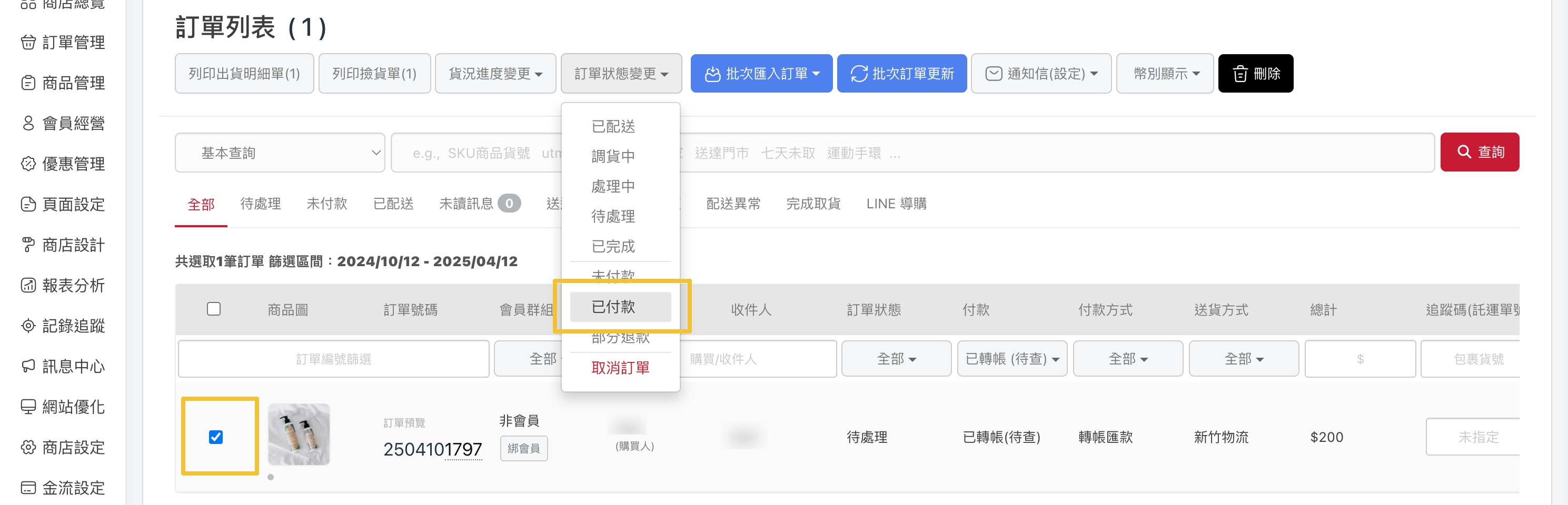 確認款項收到後,記得將訂單的付款狀態改完「已付款」,顧客將會收到系統通知信,告知訂單將安排出貨事宜。